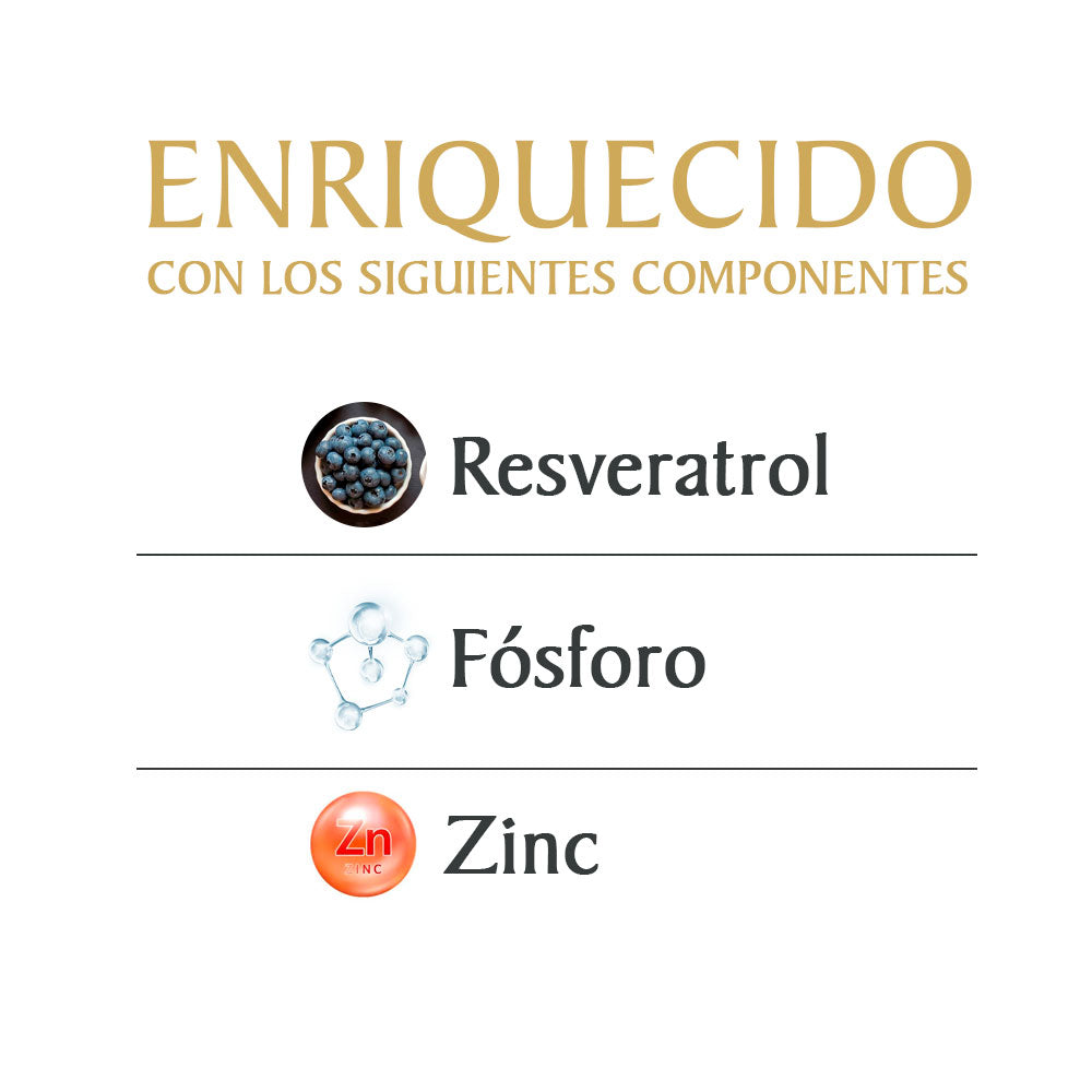 Fórmula única con calcio, magnesio, vitamina D, colágeno hidrolizado, Resveratrol, fósforo, cúrcuma y omega 3. Enriquecido con vitaminas y minerales.