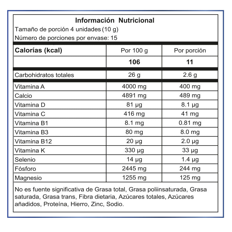 Gomas de gelatina, sin azúcar añadida, fortificado con calcio, fósforo y vitamina D. Sabor a naranja.