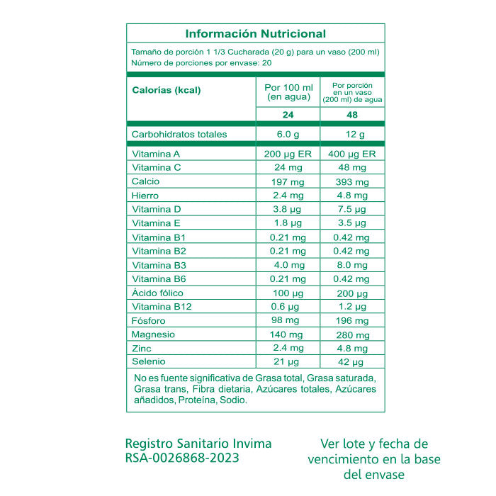 Ingredientes: Acai en polvo, Maltodextrina, Fosfato tricálcico, Citrato de magnesio, Gluconato ferroso, Vitamina C (Ácido ascórbico), Sulfato de zinc, Vitamina B3 (Niacina), sabor artificial a Vainilla(Saborizante), Vitamina E, Vitamina B1, Vitamina B2 (Riboflavina), Vitamina B6 (Piridoxina HCL), Vitamina A (Palmitato), Ácido fólico,