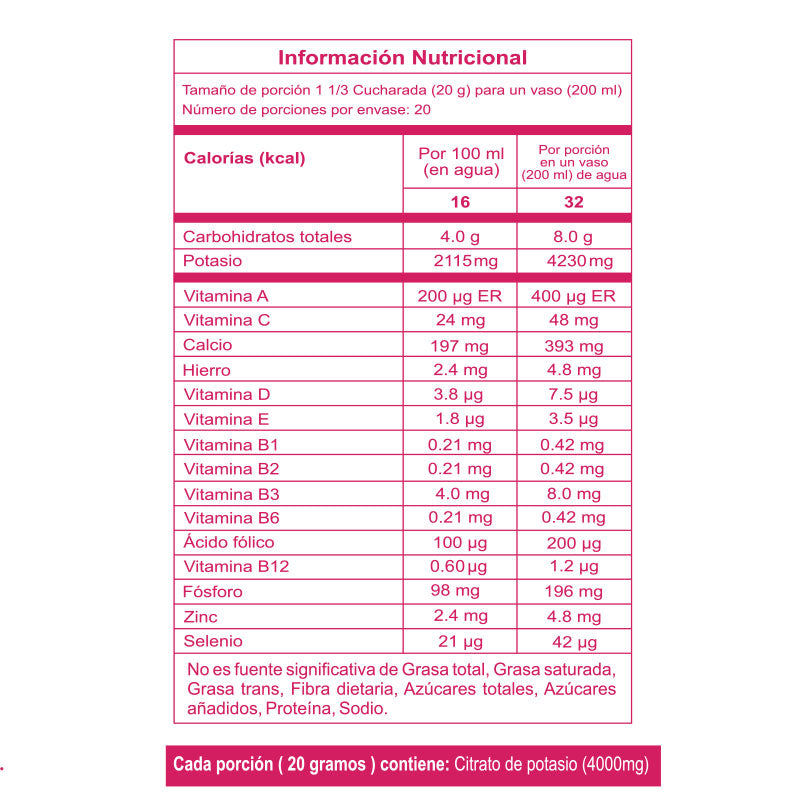 Ingredientes: Acai en polvo, Maltodextrina, Citrato de potasio, Fosfato tricálcico, Gluconato ferroso, Vitamina C (Ácido ascórbico), Sulfato de zinc, Vitamina B3 (Niacina), sabor artificial a maracuyá (Saborizante), Vitamina E, Vitamina B1, Vitamina B2 (Riboflavina), Vitamina B6 (Piridoxina HCL), Vitamina A (Palmitato), Ácido fólico, Selenito de sodio 20% potencia, Vitamina D3, Vitamina B12.